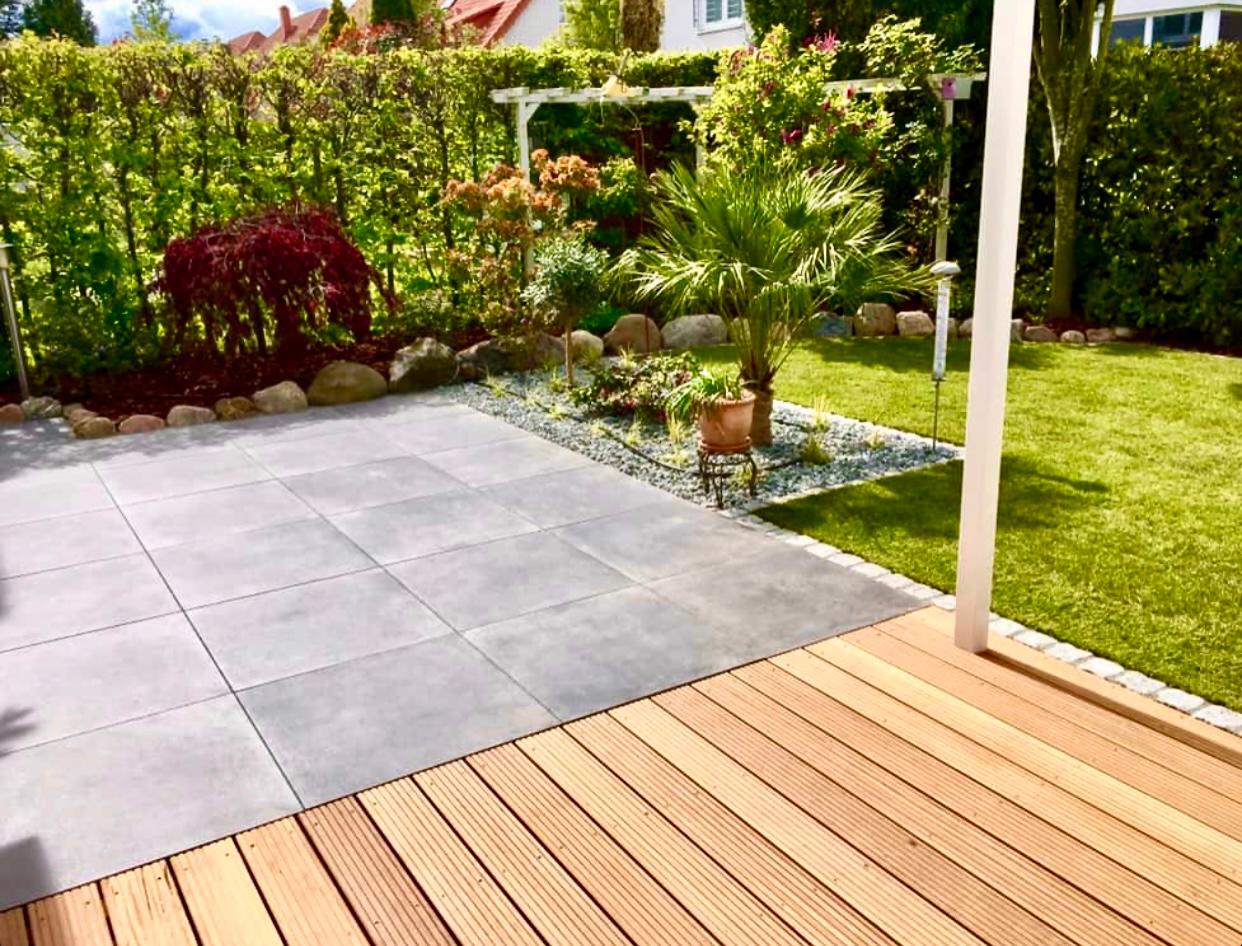 Was ist Kunststein? Das ist ein Material, das der Mensch für bestimmte Zwecke selbst entwickelt hat. Am bekanntesten ist die klassische Keramikfliese, die in praktisch jeder Abmessung und Farbgestaltung, oft auch mit Mustern aller Art verfügbar ist. In den letzten Jahren hat sie Gesellschaft bekommen: Fliesen aus Feinsteinzeug ahmen Eigenschaften der Natursteine nach. Fliesen aus Zement beeindrucken mit südländischem Ambiente und traditionellen mediterranen Mustern, die einer Terrasse ein sehr individuelles Aussehen verleihen können. Keramikfliesen für den Außenbereich sind meist stärker als die für die Verlegung in Innenräumen, denn sie müssen den Witterungseinflüssen trotzen. Ihre gebrannte und oft glasierte Oberfläche erfüllt diese Anforderung gut und richtig verlegt sind sie sehr bruchfest. Die früheren, kleinteiligen Erscheinungsbilder mit hohem Fugenanteil sind aus der Mode gekommen und von größeren Formaten und natürlichen Gestaltungen abgelöst worden. Man findet zum Beispiel dielenartige, lange Fliesen mit Holzoptik und -relief, die die Ästhetik und Haptik von Holzdielen aufnehmen, oder glatte Platten verschiedener Größen, mit denen sich Steinböden nachbilden lassen. Ihr großer Vorteil ist die Pflegeleichtigkeit und ein absolut regelmäßiges Erscheinungsbild.